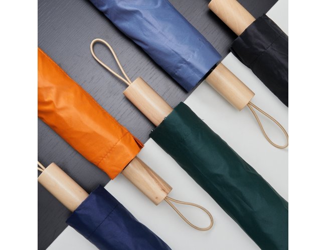 Guarda-chuva manual de nylon com proteção UV, tecido interno em vinil. Com 8 varetas e estrutura em aço, possui botão de abertura e pegador de madeira com alça de nylon. Acompanha capa protetora.