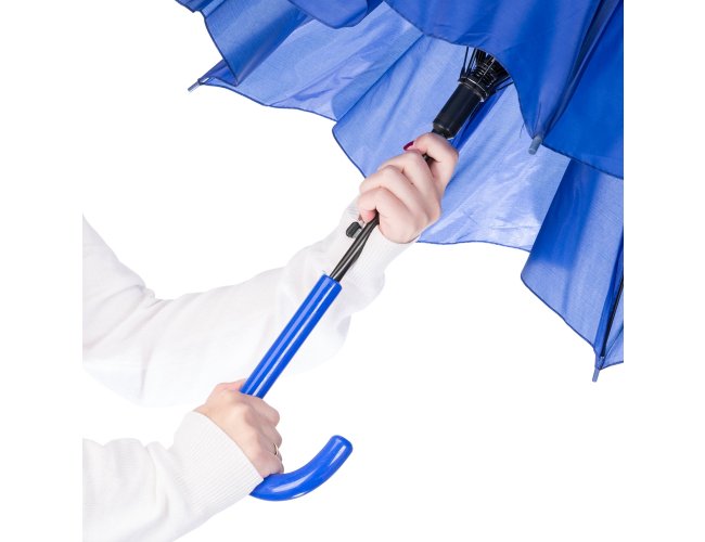 Guarda-chuva colorido com tecido de nylon e abertura automática, basta acionar o botão inferior. Personalizado com a sua logomarca. Possui 8 varetas pretas de aço, pegador e bico superior de plástico. Tamanho total aproximado (CxD): 84,5 cm x 105 cm X 105 cm ABERTO. Peso aproximado (g): 292