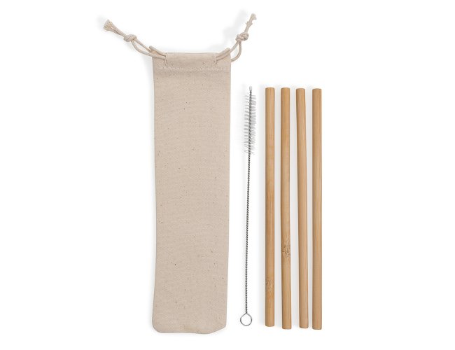 Kit contendo 4 canudos de bambu e uma escova limpadora. Embalagem em algodão reciclado.