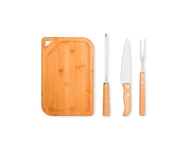 Kit para Churrasco. Composto por tábua em Bambu; faca 7", garfo trinchante e chaira em Madeira/Inox. Como cortesia, na faca 7" fazemos uma gravação com os cortes do boi.