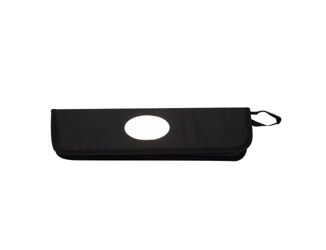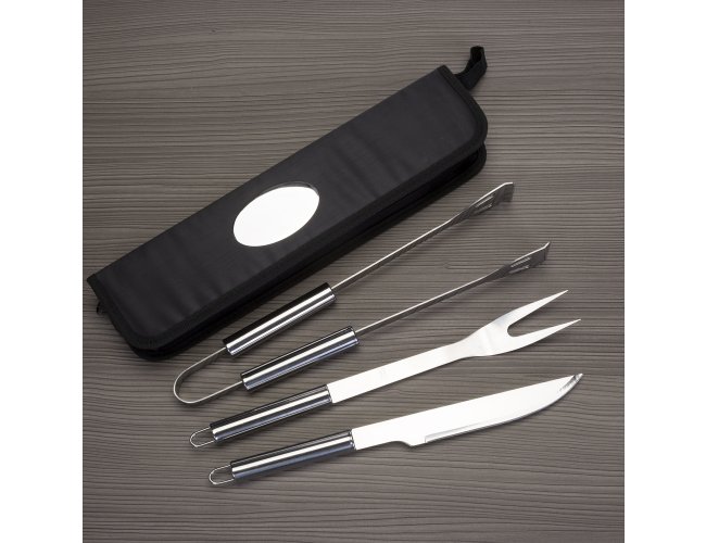 Kit churrasco 3 peças em estojo de nylon com alça. Possui: faca(acompanha proteção plástica), garfo(acompanha proteção plástica), pegador em inox e parte interna com velcro para guardar as peças. Acompanha plaqueta para gravação.