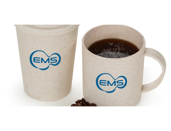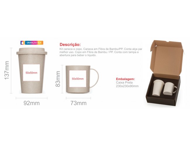 Kit caneca e copo. Conta com caneca e copo em fibra de bambu/PP. A caneca conta com alça para melhor uso e o copo com tampa e abertura para beber o líquido.
