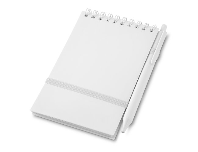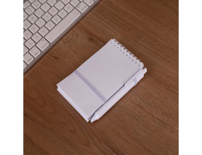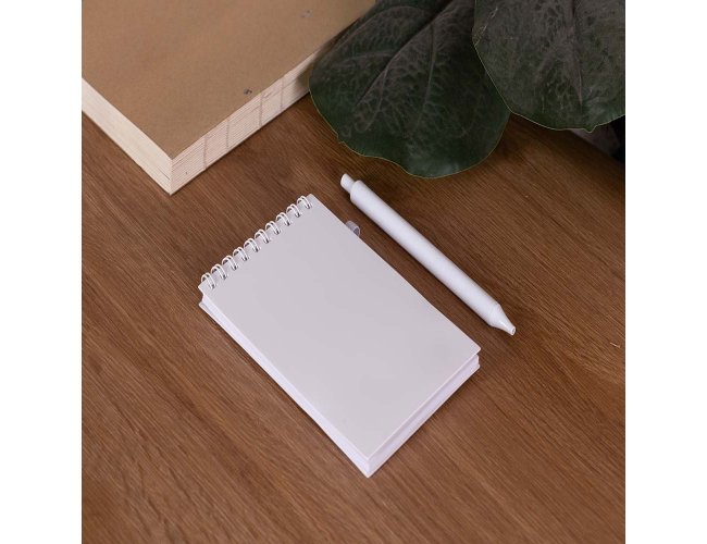 Mini caderno de anotações 14 x 9 cm capa em PP misto com wire-o; Suporte para canetas; 1 Caneta plástica retrátil.