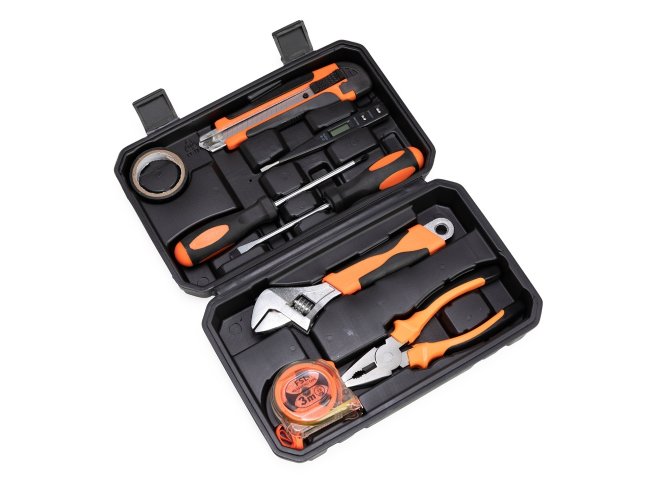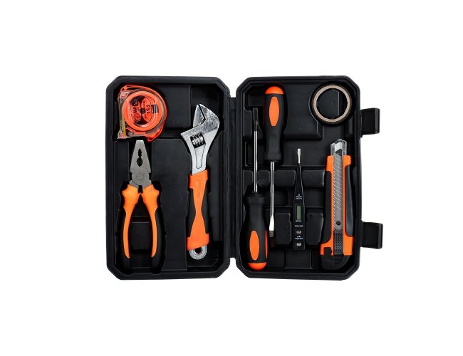 Kit ferramenta 8 peças em estojo de polietileno com trava de segurança. Acompanha: chave Philips e chave de fenda com ponteira magnética, trena de 3 metros, chave teste, estilete, alicate, fita isolante e chave inglesa.