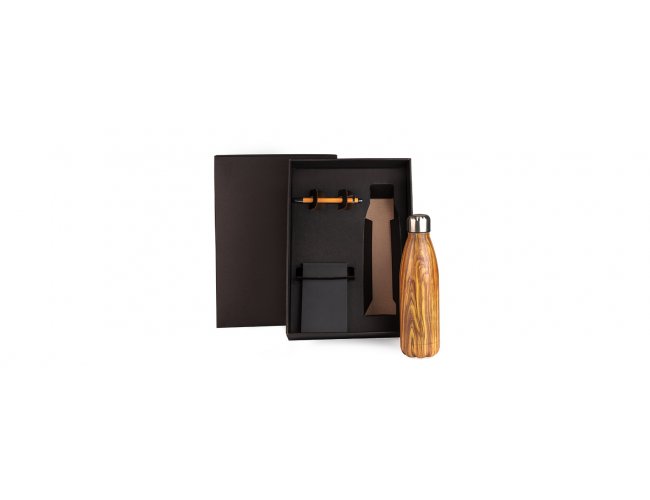 Conta com garrafa em Aço Inox com pintura amadeirada; caneta esferográfica em bambu; bloco de anotações.