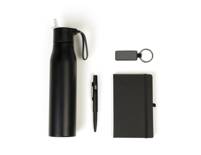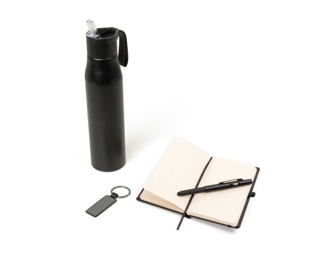 Composto por garrafa em alumínio reciclado na cor preta com capacidade de 750 ml; chaveiro em metal retangular; caderno para anotações preto com capa dura e caneta esferográfica em ABS preta.