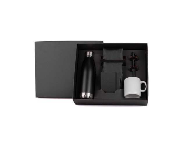 Conta com mochila sacola em nylon, garrafa em aço inox 750ml, caneca em cerâmica, caneta plástica com tampa e ponta touch e caderneta para anotações.