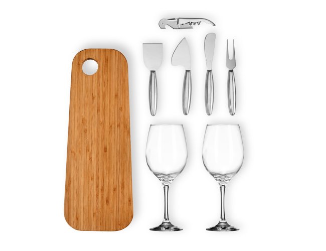 Composto por tábua em Bambu com 39x15x1,5 cm; duas taças de Vidro para Vinho; conjunto de facas em aço Inox para queijos e abridor saca-rolhas em aço inox escovado.
