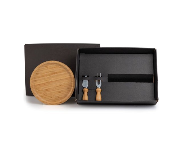 Kit para petisco / queijo. Composto por petisqueira redonda em Bambu; faca e garfo para Queijo em Madeira/Inox.