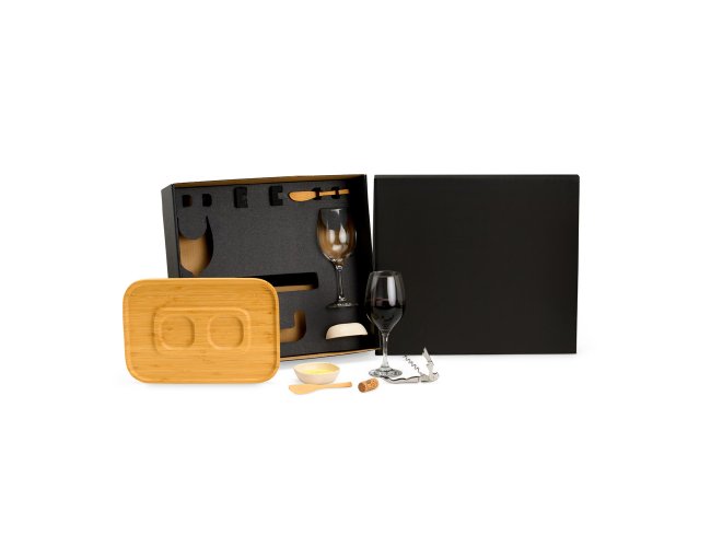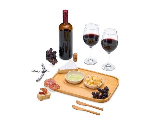 Composto por petisqueira em Bambu com duas cumbucas em Fibra de Bambu; duas espátulas de 14 cm em Bambu; duas taças em vidro para Vinho e um abridor saca-rolhas em aço Inox escovado.