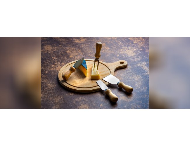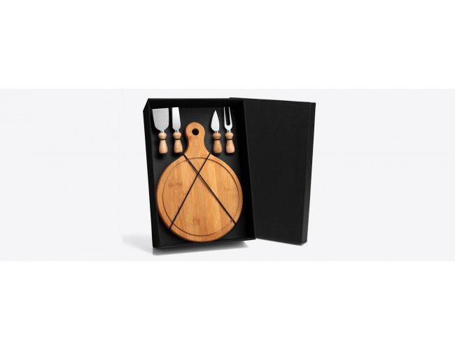 Conta com tábua com alça para queijo/petisco; Duas facas, sendo, uma com ponta e outra reta, garfo e espátula em madeira/inox; Estão perfeitamente acomodados em uma caixa para presentear.