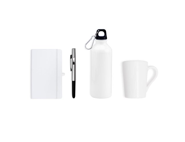 Kit composto por squeeze branco em alumínio revestido com verniz; caneca em cerâmica na cor branca; caderno para anotações branco com capa dura e caneta esferográfica em ABS prata.