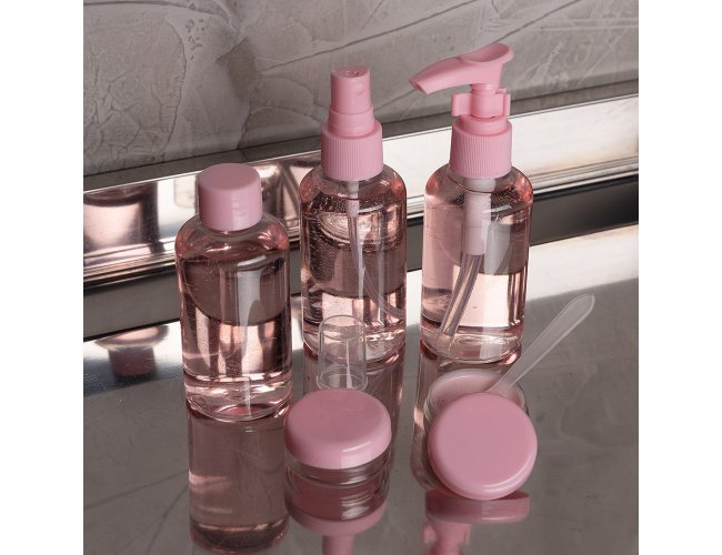 Kit viagem 6 peças em estojo ziplock. Contém frasco de 80ml com tampa spray; frasco de 80ml com tampa rosqueável; frasco de 80 ml com tampa pump; 2 potes de 10ml com tampa rosqueável e mini espátula fosca. Frascos plásticos e estojo em pvc com puxador plástico.