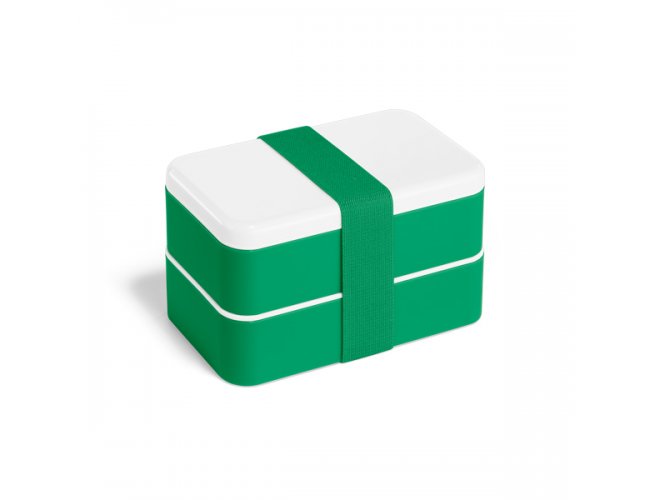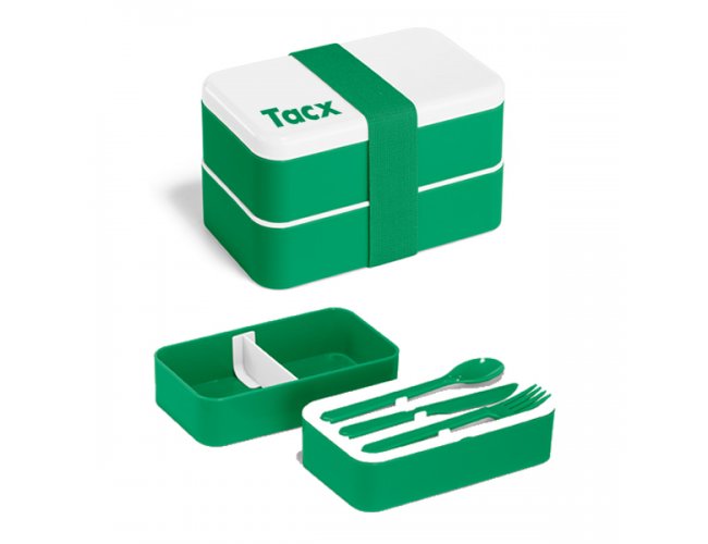 Marmita em PP e PS com 2 compartimentos (680 mL cada) e 1 divisória removível. Incluso 3 talheres: garfo, faca e colher. Fecha com banda elástica e está apta para micro-ondas, retirando a tampa. Certificação EU Food Grade.