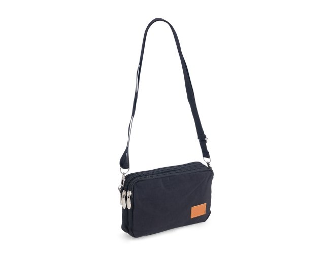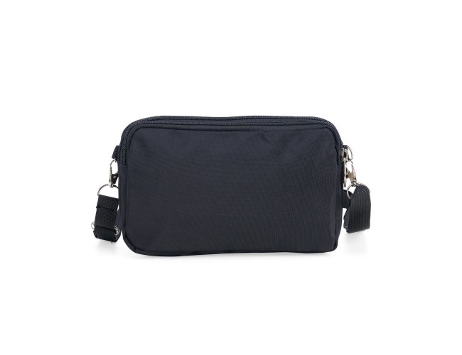 Bolsa de ombro em nylon resistente à água, com três compartimentos, alça regulável e etiqueta com espaço para personalização em couro sintético. Executando o papel de ser um bolso extra para guardar e encontrar rapidamente os acessórios do dia a dia.
