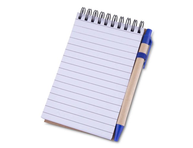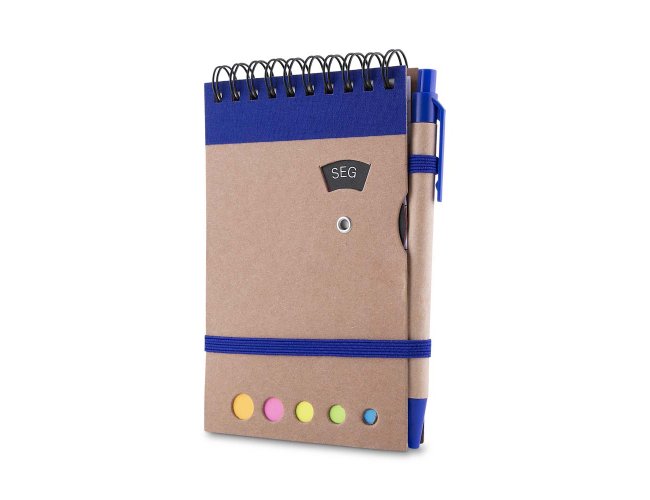 Mini Caderno com capa em papel kraft, com 70 folhas pautadas e blocos adesivos (sticky notes) coloridos. Acompanha disco rotativo na capa com os dias da semana e caneta produzida em papelão reciclado com detalhes em plástico e escrita em azul.