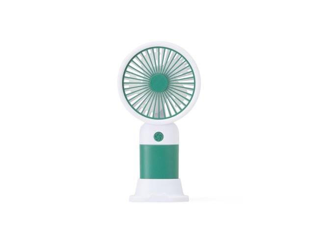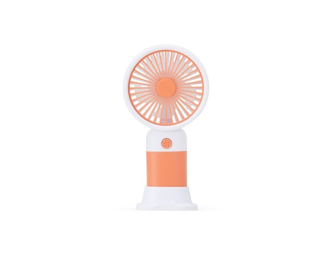 Mini ventilador plástico recarregável com base removível e botão de acionamento. Acompanha cabo usb.