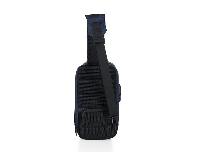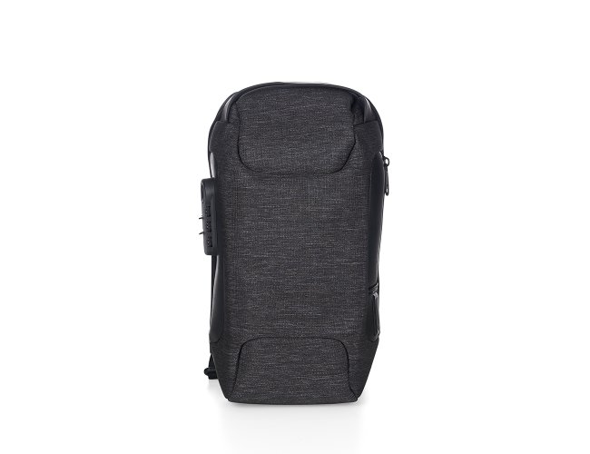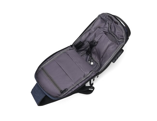 Mochila de ombro com entrada USB e Micro USB lateral. A mochila possui, um compartimento principal com segredo (TSA), bolso oculto na parte traseira, além de 3 divisórias internas, sendo uma capaz de armazenar tablet, netbook ou Ipad de até 9 polegadas. Alça de mão e detalhes laterais e inferiores em couro sintético, tira de nylon na alça, 2 fivelas para opção de encaixe da alça, revestimento espumado antitranspirante na parte traseira e na alça, e tecido resistente a água.