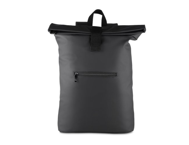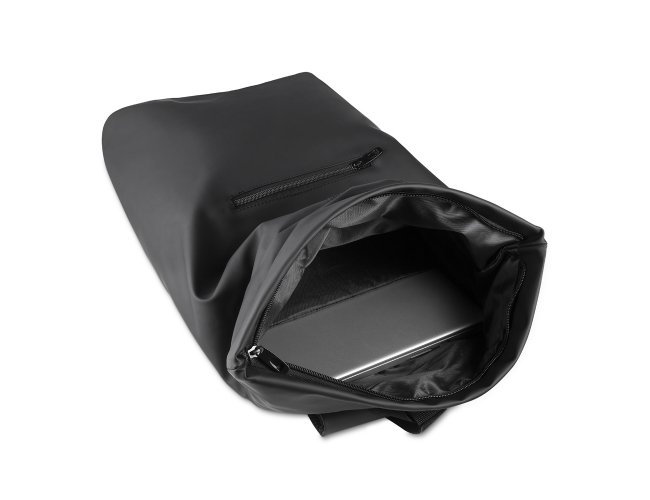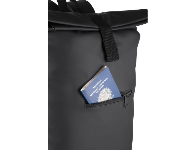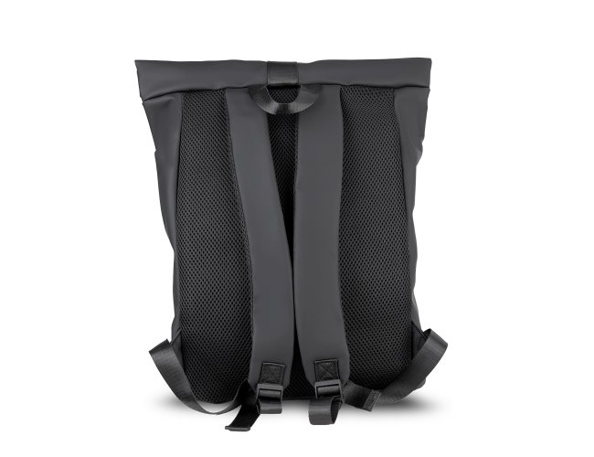 Mochila em 100% PU com interior em poliéster 210D e capacidade de 16,5L. Possui compartimento principal com zíper e alça de fechamento em velcro, compartimento frontal com zíper, espaço para notebook de até 15,6”, alça de mão e alça de ombro acolchoada.