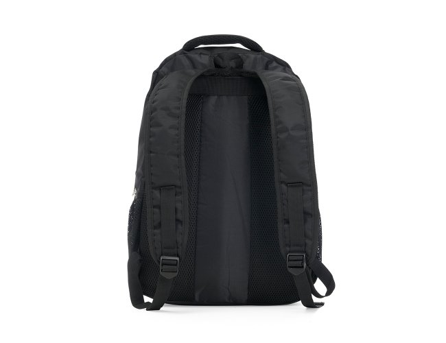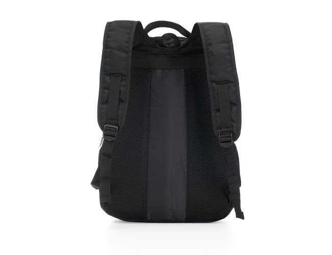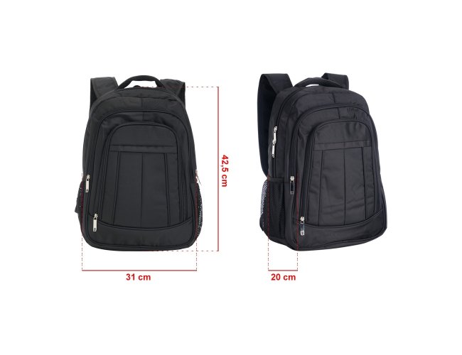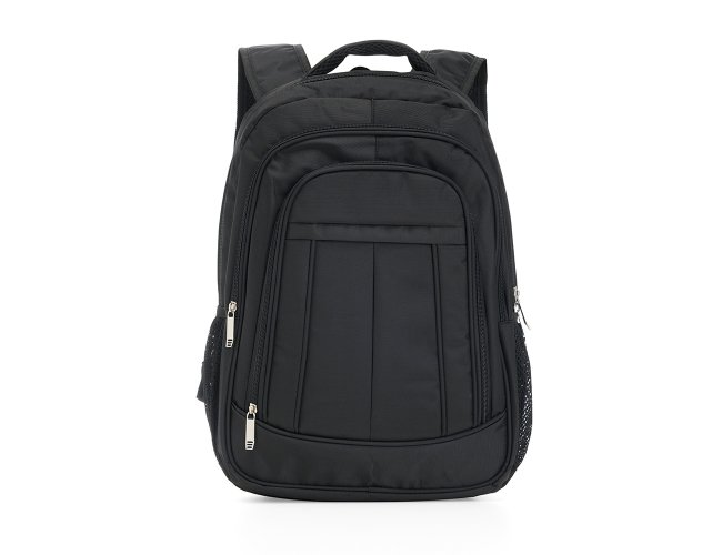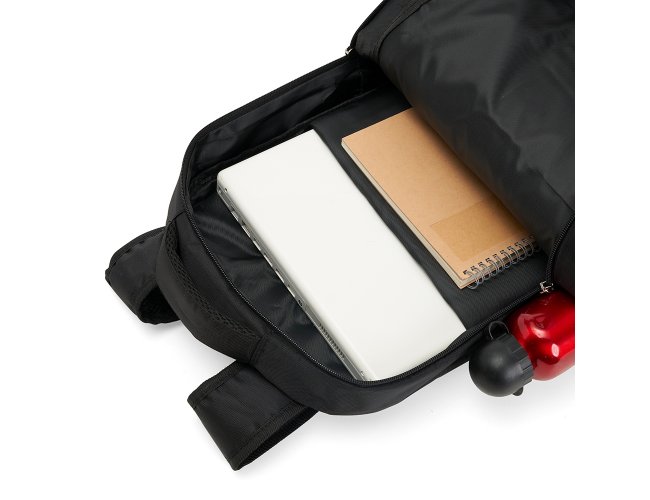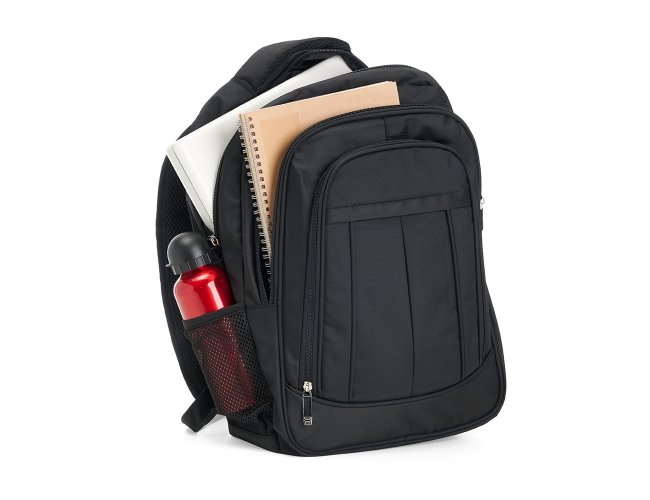 Mochila de poliéster 25 litros com três compartimentos, sendo o principal com bolso para notebook 15,6. A mochila possui bolsos laterais em malha, duas alças de mãos e área costada com revestimento espumado.