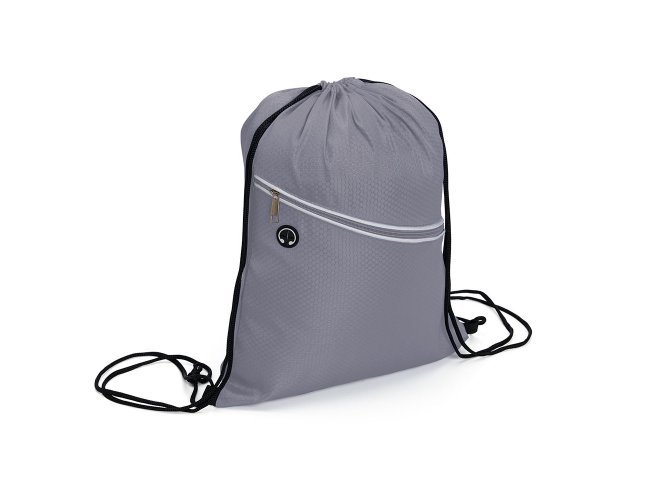 Mochila saco impermeável em fibra de poliéster. Contém bolso diagonal na parte frontal com entrada para fones de ouvido e alças de nylon.
