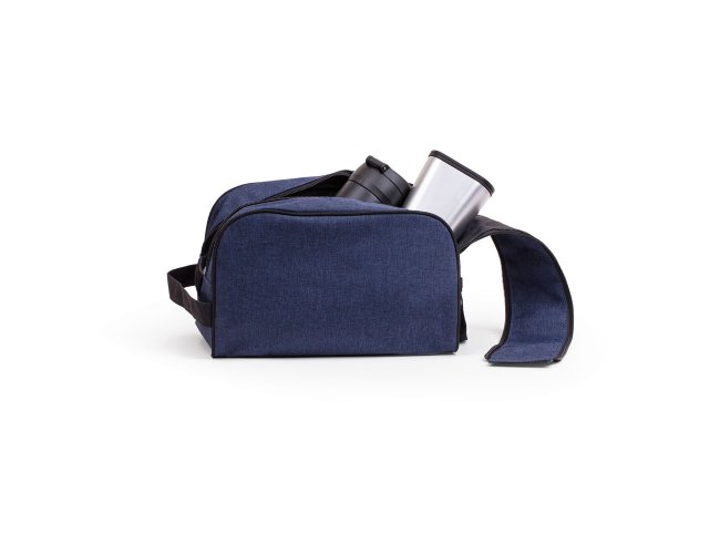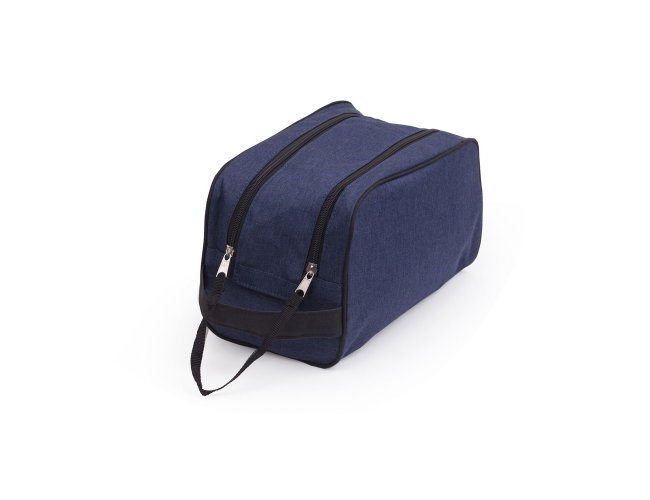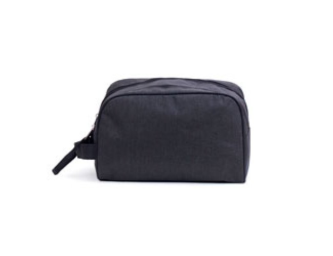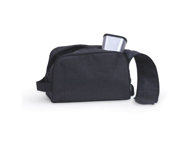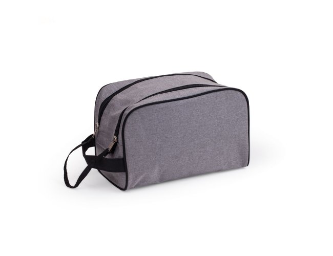 Necessarie tecido polyester, cursor duplo para fechamento com alça, trava com velcro, alça de mão, gravação Frontal.