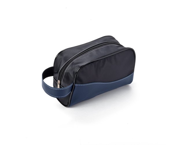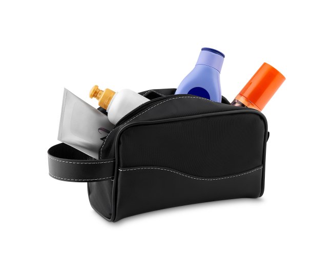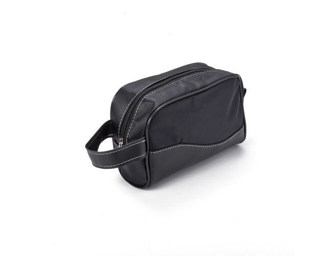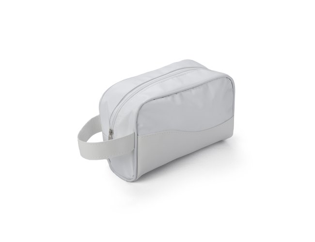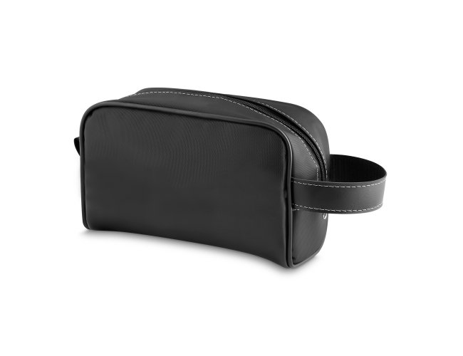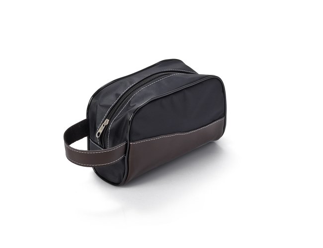 Nécessaire em PU no tecido externo e forro sintético Bidim, e alça lateral, Gravação frontal na opções: serigrafia e plaquinha.