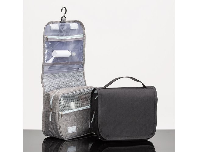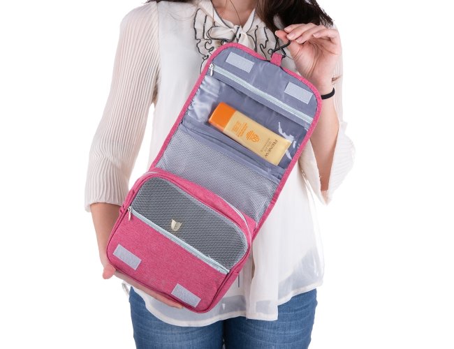 Necessaire organizadora em tecido nylon Oxford, abertura frontal por velcro e alça superior, parte interna com gancho plástico; bolso interno superior de pvc e bolso de tela superior; dois bolsos inferiores de zíper, sendo o primeiro com detalhe superior em tela e 3 divisões internas e o segundo na parte frontal interna. Perfeita para lhe acompanhar em viagens e até mesmo transportar seus itens pessoais do dia a dia com organização e praticidade.