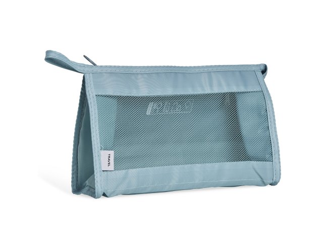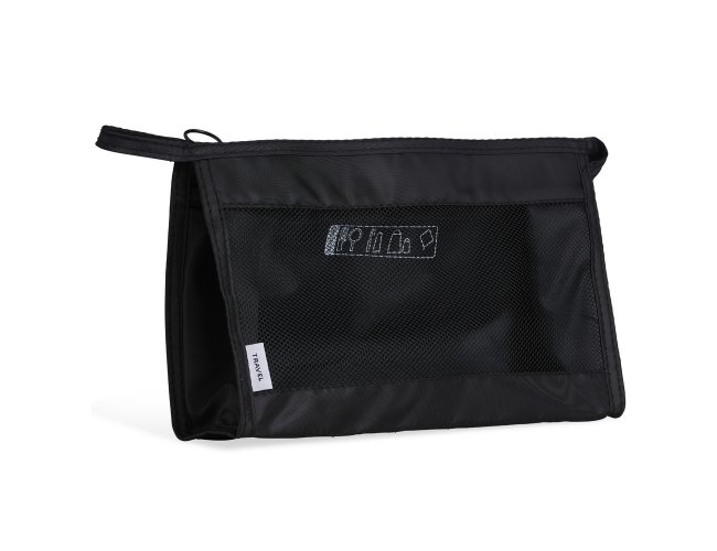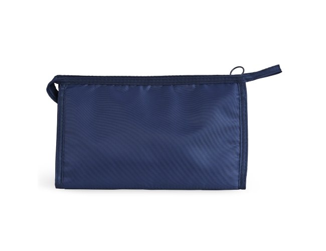 Nécessaire organizadora em poliéster, possui compartimento principal com bolso de zíper resistente à água.