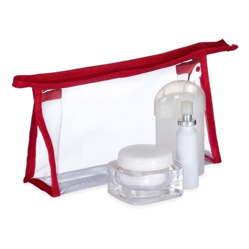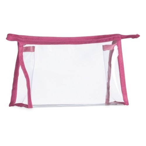Nécessaire em plástico transparente impermeável com detalhes em nylon e fechamento em zíper.