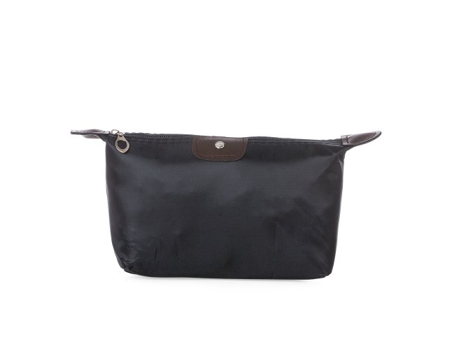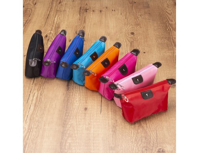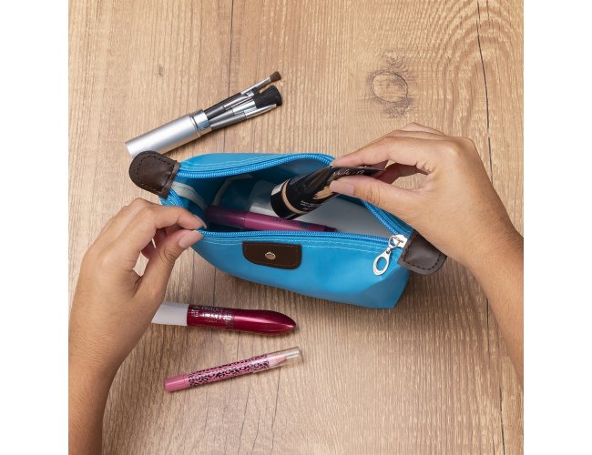 Descrição: Necessaire impermeável de poliéster com detalhes em couro sintético e parte interna com revestimento emborrachado, possui um “botão” no detalhe do couro frontal.
