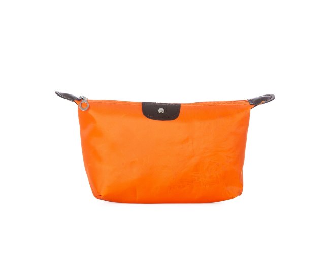 Necessaire impermeável de poliéster com detalhes em couro sintético e parte interna com revestimento emborrachado, possui um “botão” no detalhe do couro frontal.