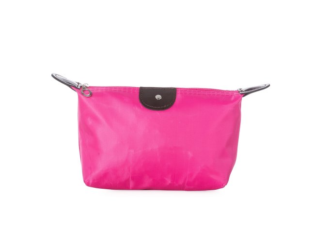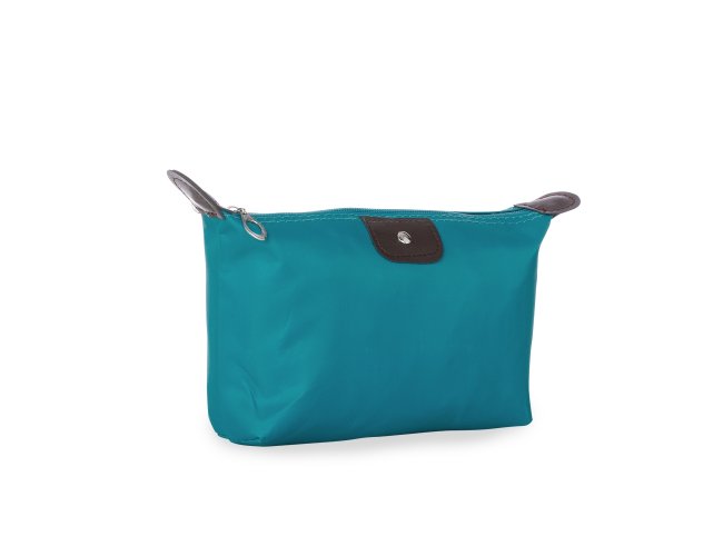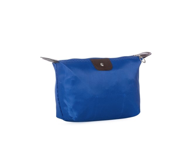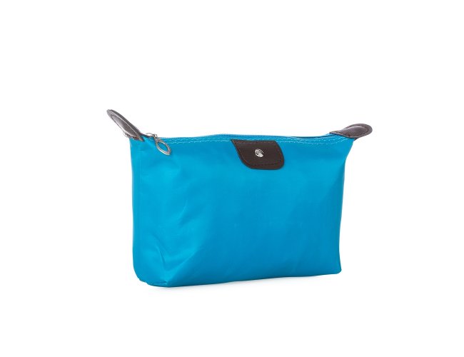 Descrição: Necessaire impermeável de poliéster com detalhes em couro sintético e parte interna com revestimento emborrachado, possui um “botão” no detalhe do couro frontal.