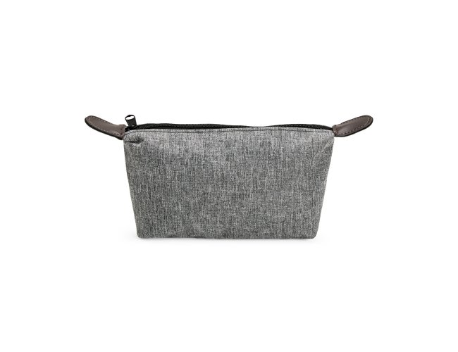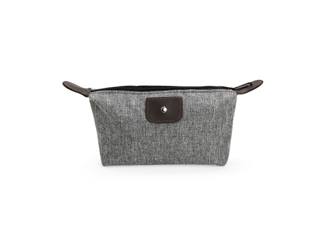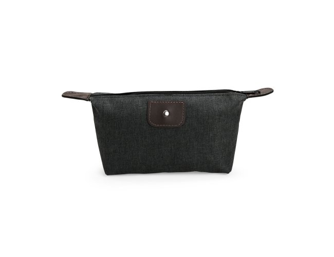 Nécessaire compacto confeccionado em Poliéster com mescla de PVC resistente à água, com fechamento em zíper e detalhes em bidim e metal.