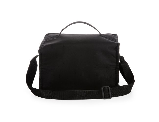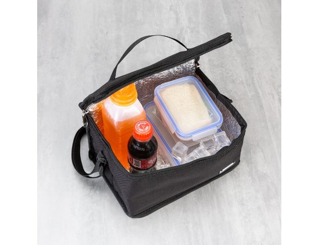 Necessaire térmica 4 litros com plaquinha metálica frontal para personalização. Alça de mão superior e alça maior ajustável, tecido de nylon e parte interna com revestimento térmico.
