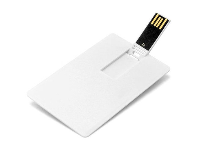 Pen drive formato cartão, material em plástico resistente, acabamento frontal liso e parte traseira com relevo do suporte. Personalizado com a sua logomarca.