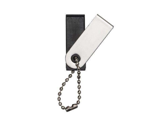 Pen drive pico 16GB , carcaça brilhante de metal, acompanha corrente e basta rotacionar o suporte plástico preto para encaixar a memória.