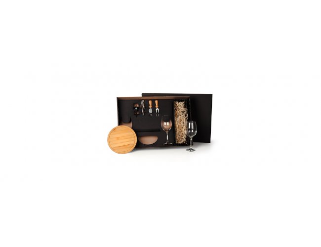 Kit para Queijo e Vinho. Conta com tábua para Queijo/Petiscos em Bambu; duas facas, sendo uma com ponta e outra reta, garfo e espátula em Madeira/Inox; duas taças para vinho em vidro; abridor e tampão em Metal; espaço para garrafa com palha (NÃO ACOMPANHA GARRAFA). Estão perfeitamente acomodados em uma caixa para presentear.