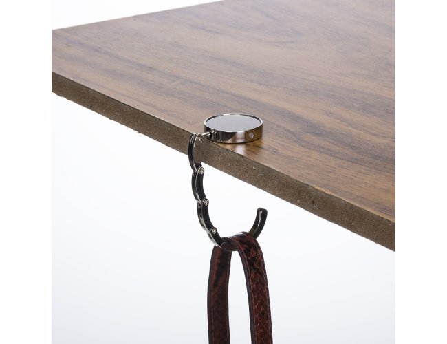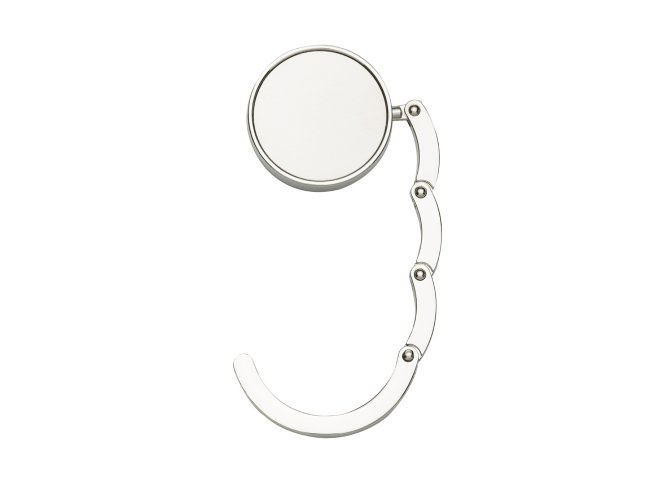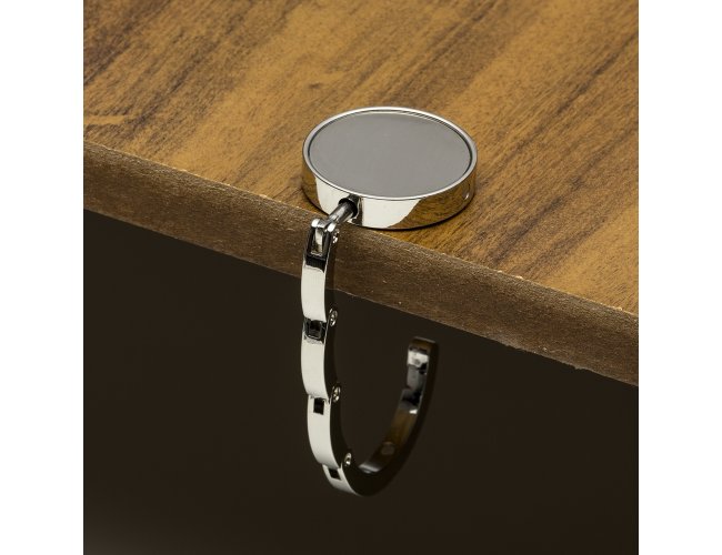 Porta bolsa de metal dobrável, possui chapa central redonda para gravação e parte traseira borracha anti deslizante. Para utilizar o porta bolsa basta puxar a lateral(é imantado) e abri-lo.