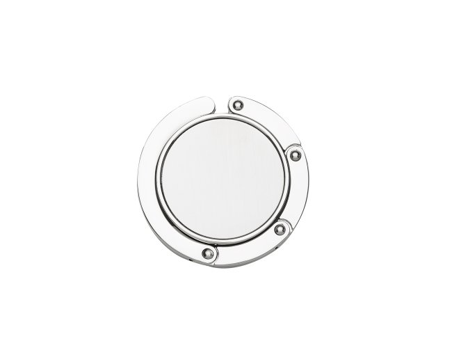 Porta bolsa de metal dobrável, possui chapa central redonda para gravação e parte traseira borracha anti deslizante. Para utilizar o porta bolsa basta puxar a lateral(é imantado) e abri-lo.