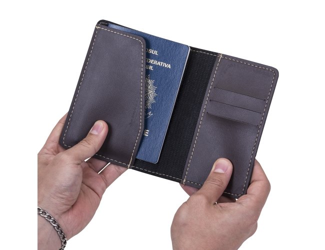 Porta-passaporte Bidins em couro sintético, possui três compartimentos na lateral para cartões.