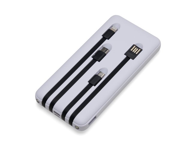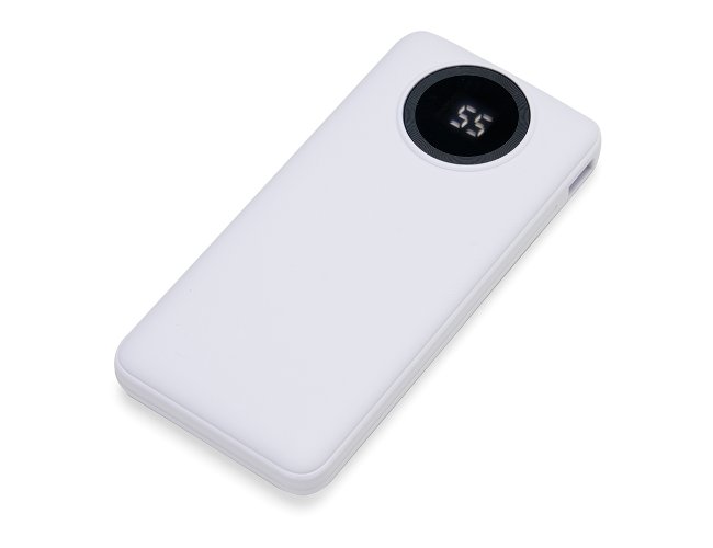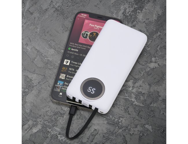 Carregador portátil de 10.000mAh com display digital indicador de bateria, contém duas lanternas de led e quatro cabos de saída acoplados, sendo: saída Lightning, saída Tipo-C, saída V8 e saída USB. O carregador possui uma porta USB dupla (entrada e saída) com carga rápida e outras duas portas de entrada: V8 e Tipo-C. Acompanha cabo USB.