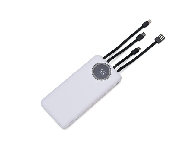 Carregador portátil de 10.000mAh com display digital indicador de bateria, contém duas lanternas de led e quatro cabos de saída acoplados, sendo: saída Lightning, saída Tipo-C, saída V8 e saída USB. O carregador possui uma porta USB dupla (entrada e saída) com carga rápida e outras duas portas de entrada: V8 e Tipo-C. Acompanha cabo USB.
