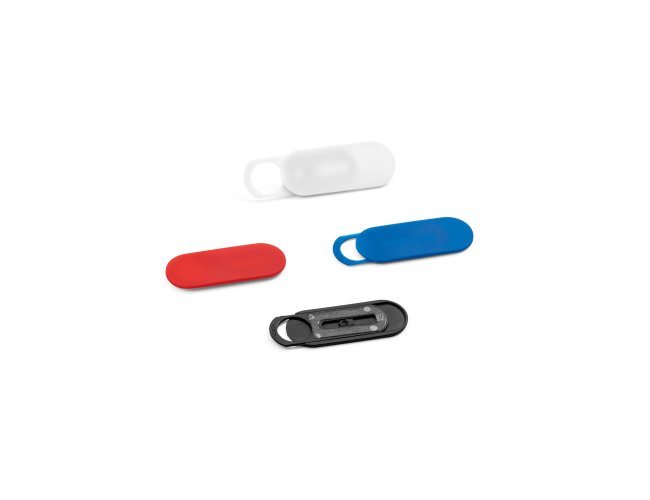 Protetor para webcam em PP com tampa deslizante e autocolante no verso. Formato universal para smartphone, tablet, notebook e computador de secretária. 32 x 13 x 1,5 mm | Aberto: 43 x 13 x 1,5 mm