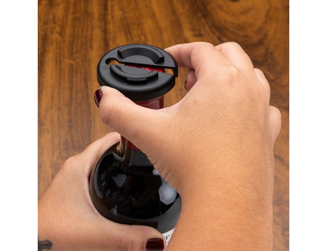Modo de uso: Para utilizar o cortador de lacre, posicione a área com lâminas virada para a garrafa, posteriormente pressione o acessório como se fosse fechá-lo e rotacione a peça para cortar o lacre do vinho. Na área superior do saca rolhas há um compartimento para pilhas com desenhos indicativos de abertura e trava, abra a tampa conforme exibido e insira 4 pilhas AA para o funcionamento do produto. Posicione o saca rolhas sob a garrafa e segure o botão inferior do produto para que seja iniciada a extração da rolha, após a retira desta, segure o botão superior do produto para que a rolha seja removida da parte interna do saca rolhas.