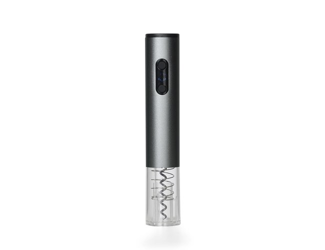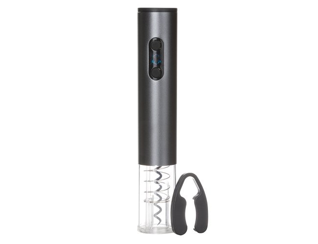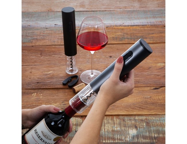 Saca rolhas elétrico com LED e cortador de lacre. Parte superior em alumínio e parte inferior acrílica, possui compartimento superior com tampa para 4 pilhas AA (não acompanha pilhas), painel com iluminação LED e botões para extração e remoção de rolhas. No modo extração a área acrílica é iluminada pelo LED. Acompanha cortador de lacre. OBS.: Não afundar o produto na água ou qualquer outro tipo de líquido.
