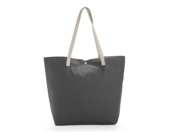 Sacola confeccionada em couro sintético à base de PVC com par de alças de costura externa e botões magnéticos metálicos para fechamento. Possui revestimento interno em poliéster e bolso compacto com fechamento em zíper.