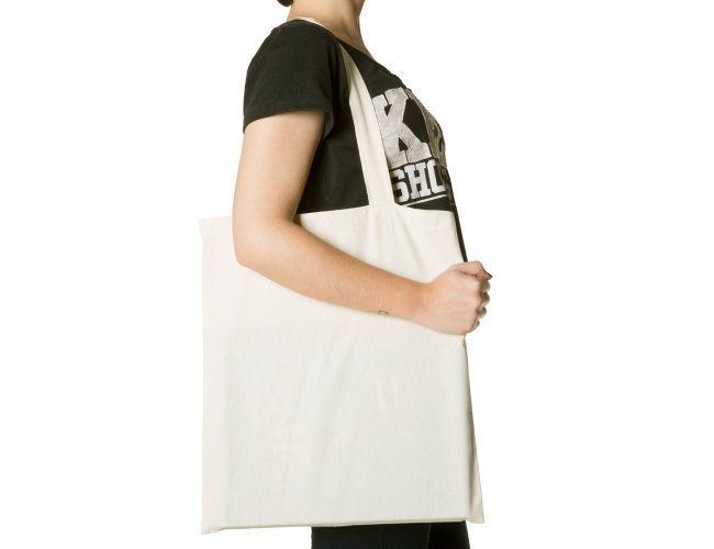 Sacola de algodão com alças costuradas na parte interna.