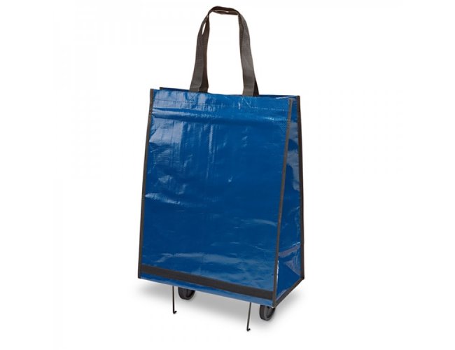 Sacola dobrável com carrinho. PP-Woven: 150 g/m². Rodas dobráveis, fundo semi-rígido e bolso interior. Alças em webbing de 62 cm.