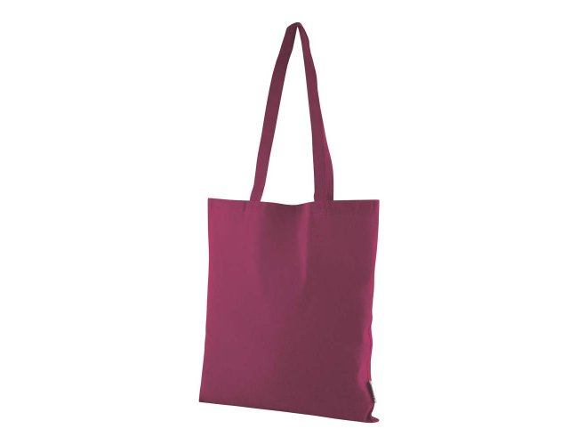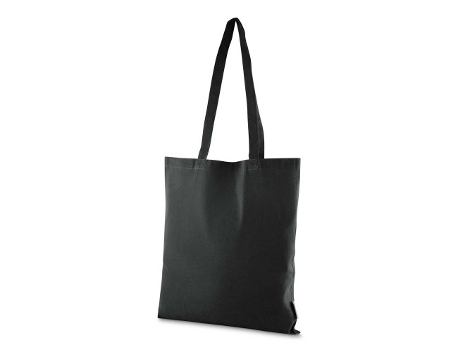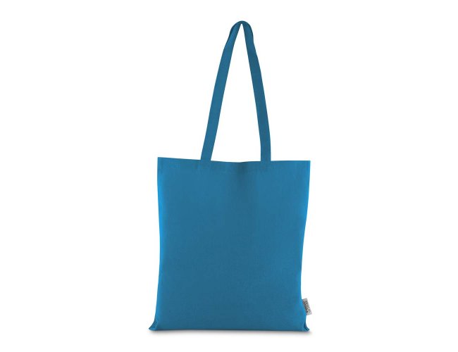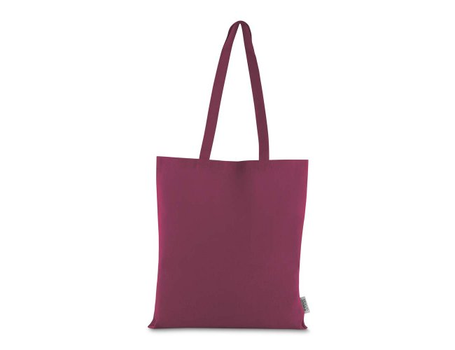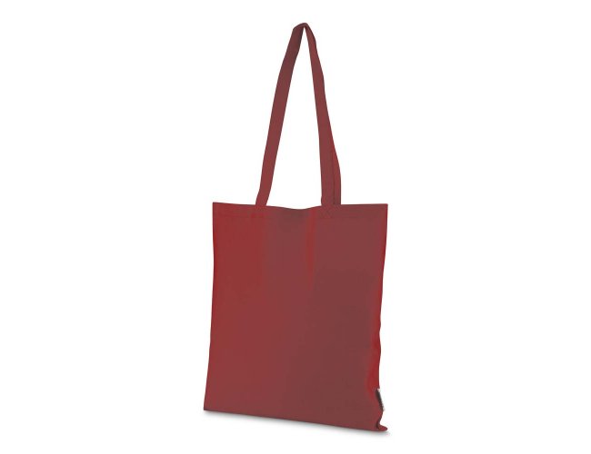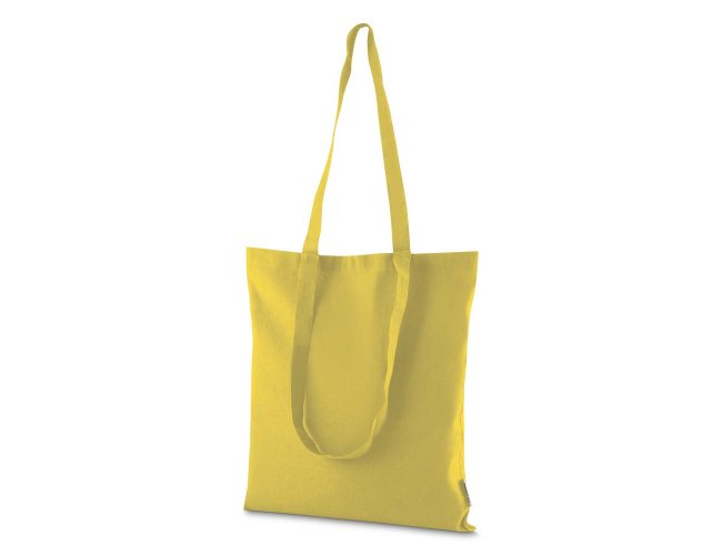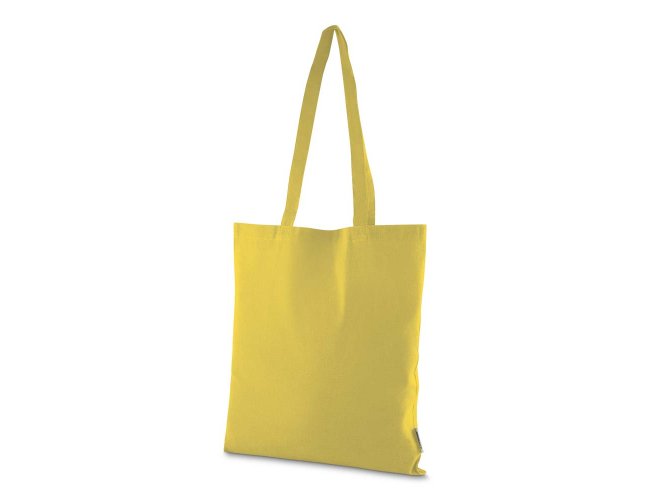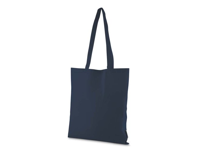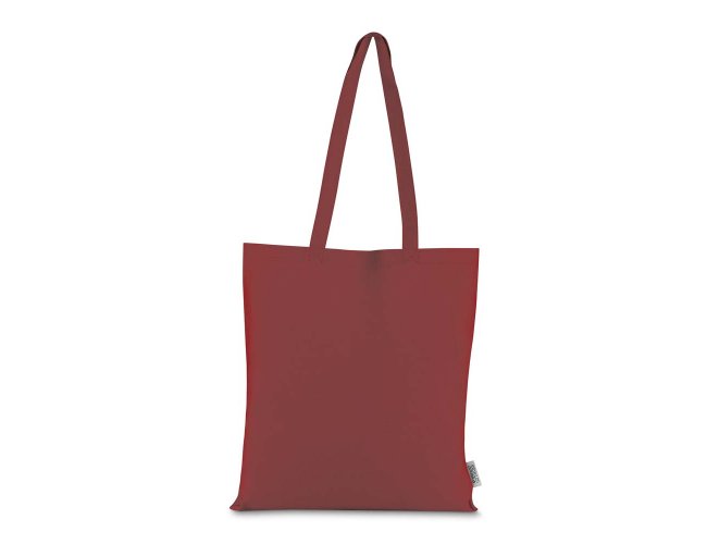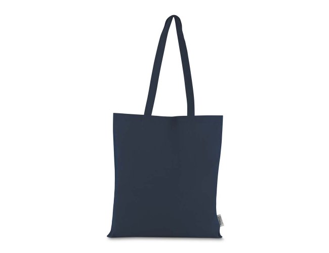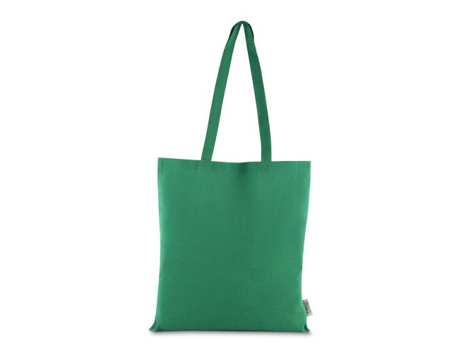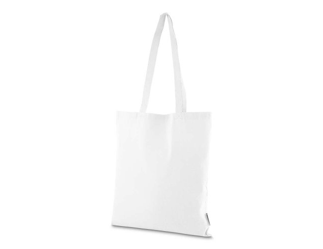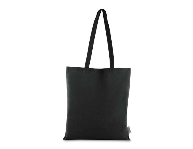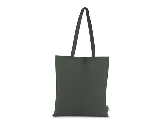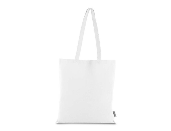 Bolsa confeccionada em algodão sólido reciclado, com gramatura de 140g/m², dimensões de 42 x 38 cm e alça de comprimento fixo medindo 33 cm.